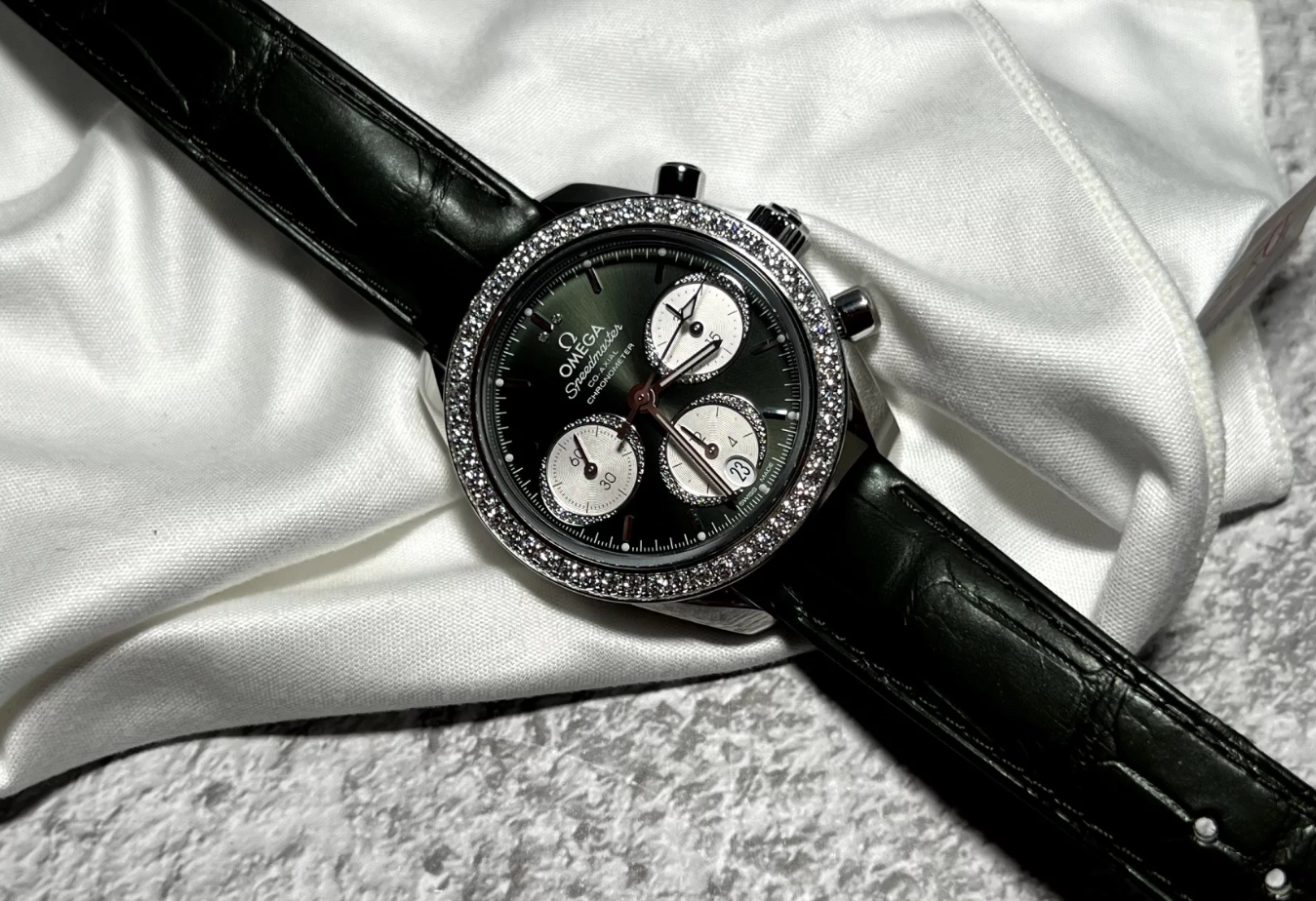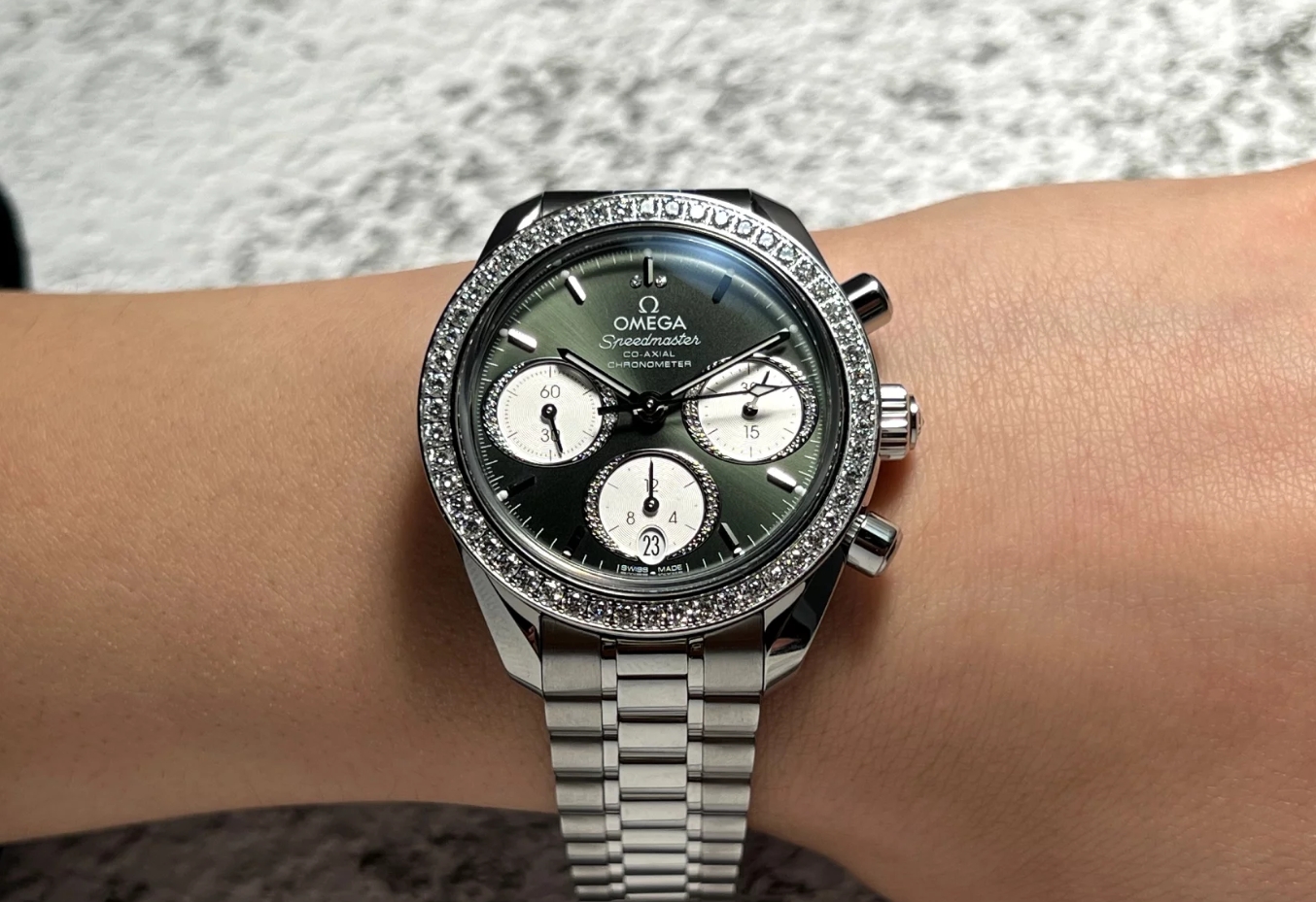 Taking a closer look at the dials, they’ll certainly be the most intriguing aspect of the new releases, as they tie in the diamond-clad bezels. The horizontally orientated, oval sub-dials now feature elegant diamond surrounds, following the shape of the ellipse. The brown sunburst on with the full Sedna gold treatment is certainly my pick of the bunch, but that’s not to say that the green option isn’t a valid one. Two final, small touches you may not notice at first are the vertical oval (or egg-shaped, if you ask me), surround of the date window at 6 o’clock, and the two tiny diamonds replacing the usual dots of the iconic Speedmaster 12 o’clock index.